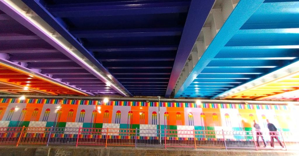 There has been a bit of a push in the last few years to deal with our shabby local underpasses. Thessaly Road in Nine Elms went first, with a design competition that attracted over 100 entries from ambitious emerging architects, followed by a major makeover (mainly funded by Nine Elms developers) that involved an explosion of colour. It’s quite striking, it definitely changed the feel of the bridge which had previously been relatively clean but distinctly dark and gloomy, and it seems to have lasted well.