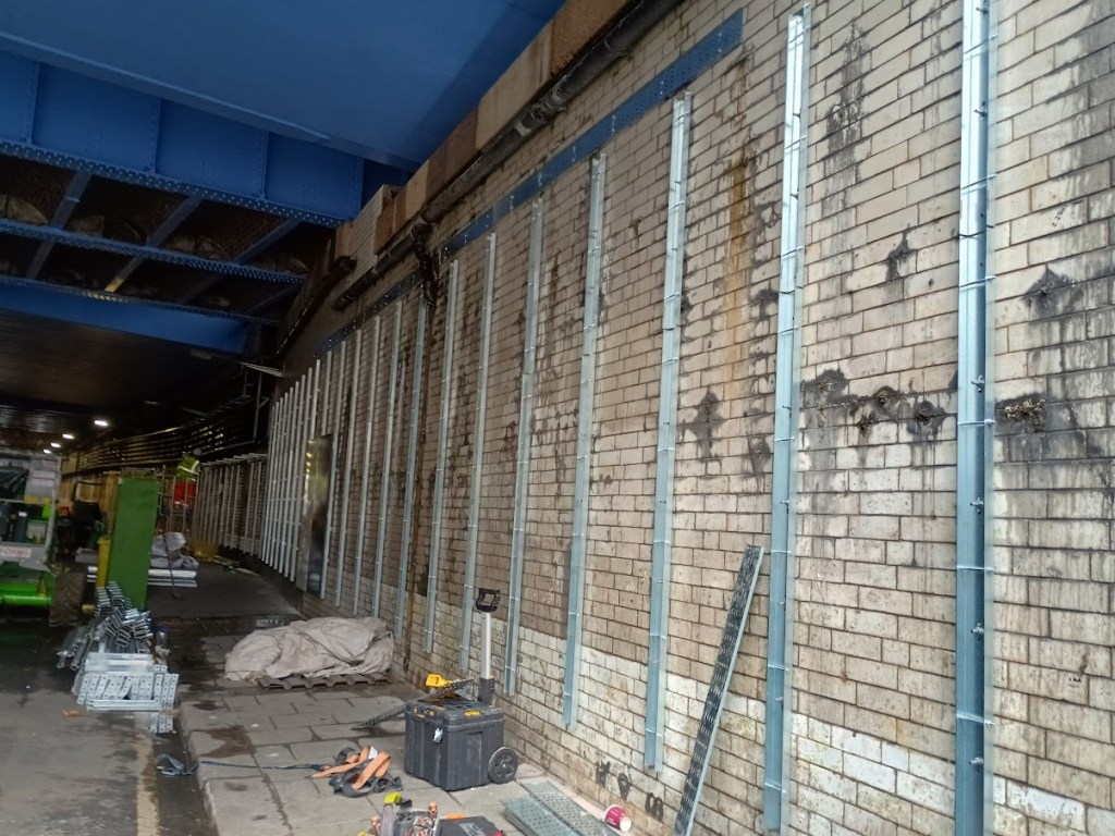 The walls either side of the underpass are currently being covered over with galvanised steel battens, which will hold the planned panels right along both sides of the bridge. These will be made of vitreous enamel – a super strong material produced by the same people who make signs for TfL, so we can be fairly confident it will be tough and long-lasting (the planning application includes details of how graffiti is cleaned off this type of panel).