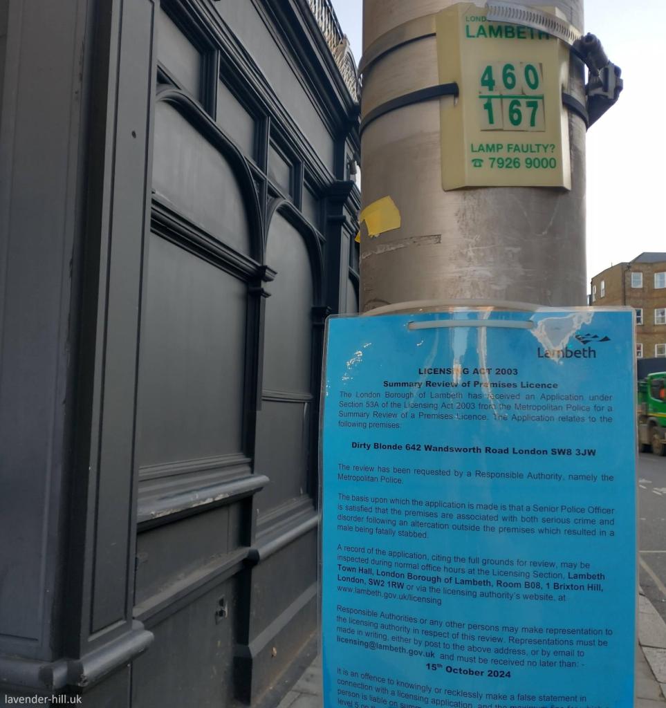 The whole area was closed for two days for a forensic investigation of the road surface – leaving Premier Inn’s guests somewhat marooned, both Tesco and Sainsbury’s closed, and all buses suspended. Our little-known article suddenly gained enormous numbers of readers. We suspect Lambeth’s licensing officers were also having a quick look at the status of the club – especially given that it had been operating in what was a bit of a licensing grey area for some years. Dirty Blonde’s license was suspended almost immediately, followed by the announcement of a Summary Review – on the grounds that a senior police officer was satisfied that ‘the premises are associated with both serious crime and disorder following an altercation outside the premises which resulted in a male being fatally stabbed‘.